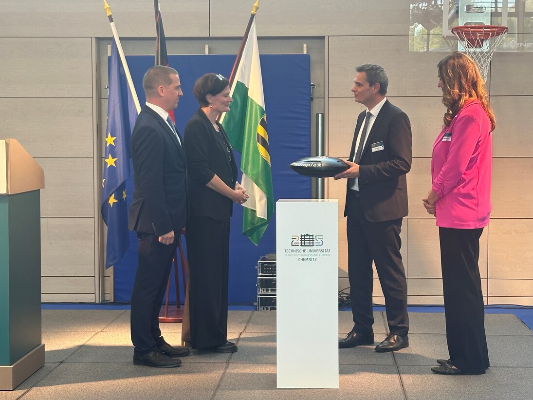 Finanzminister Christian Piwarz sowie Falk Reinhardt, Technischer Geschäftsführer, und Oliver Gaber, Kaufmännischer Geschäftsführer des SIB, haben am 14. August 2025 Heike Krenkel als neue Leiterin der SIB-Niederlassung Chemnitz offiziell in ihr Amt eingeführt. Die Amtseinführung fand in der Universitätsbibliothek der Technischen Universität Chemnitz statt.